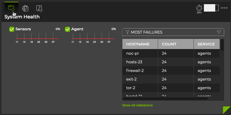 The health of each system protocol or service is represented on the left side of the card by a distribution of the health score, a trend indicator, and a percentage of successful results. The right side of the card provides a listing of devices with failures related to agents and sensors.