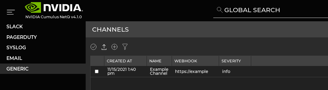 cumulus@switch:~$ netq add notification channel slack slk-netq-events webhook https://hooks.slack.com/services/text/moretext/evenmoretext Successfully added/updated channel slk-netq-events -