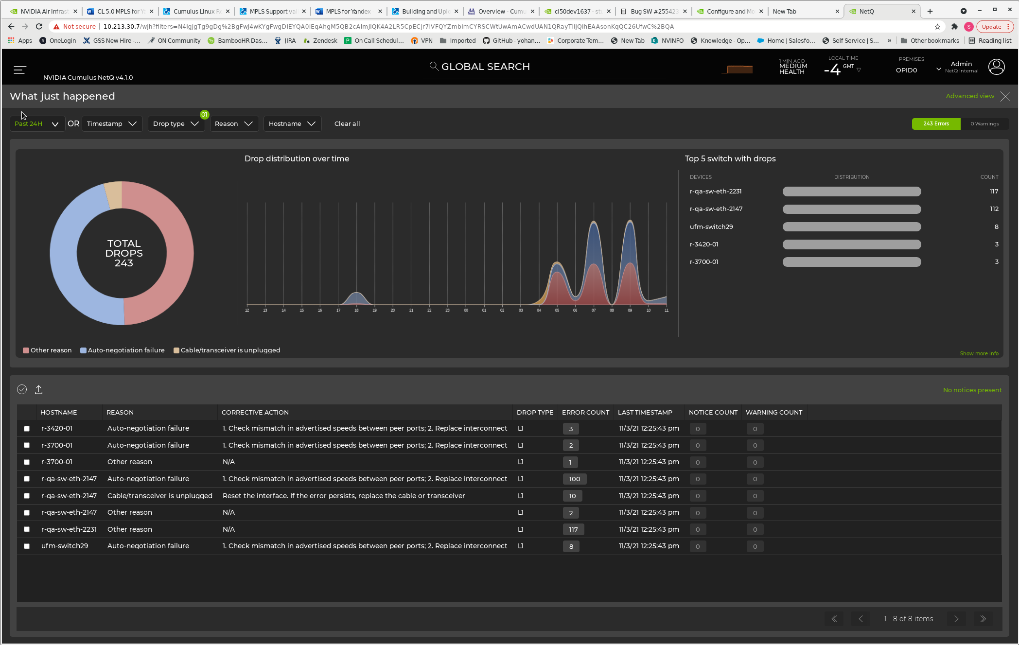 The What Just Happened (WJH) feature, available on NVIDIA switches, streams detailed and contextual telemetry data for analysis. This provides real-time visibility into problems in the network, such as hardware packet drops due to buffer congestion, incorrect routing, and ACL or layer 1 problems. You must have Cumulus Linux 4.0.0 or later, SONiC 202012 or later, and NetQ 2.4.0 or later to take advantage of this feature.