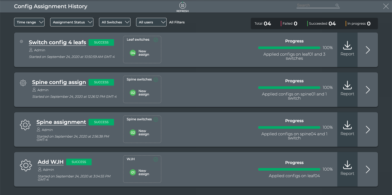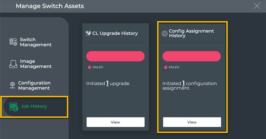 Click View on the Config Assignment History card to open the details of all assignment jobs. Refer to Manage Switch Configurations for more detail about this card.