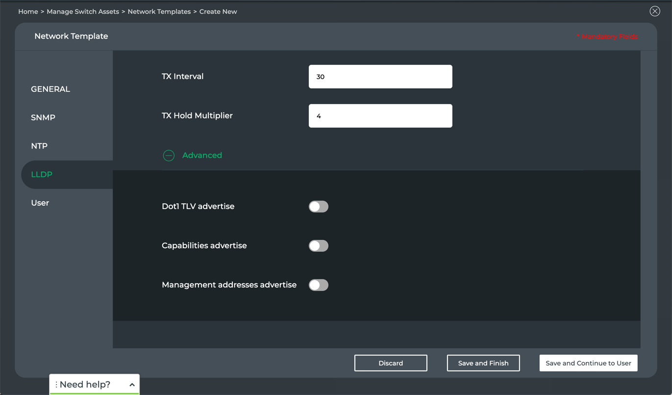 LLDP advertises device identities, capabilities, and neighbors. The network template enables you to specify how often you want the advertisement to take place and how long those messages should remain alive on the network.