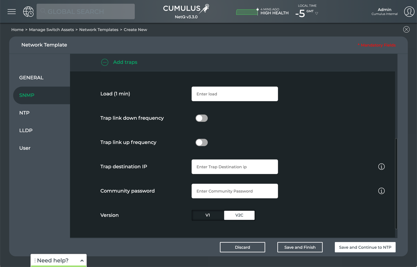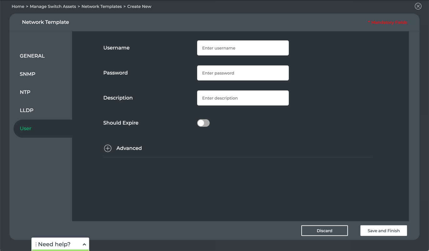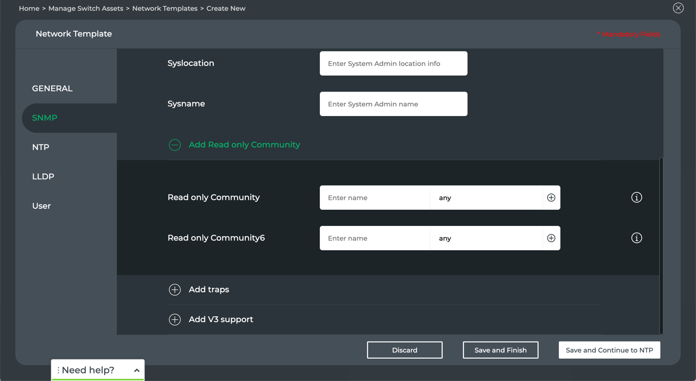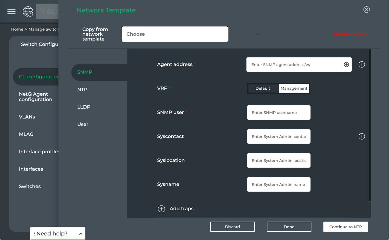 Decide which aspects of configuration you want included in this template: SNMP, NTP, LLDP, and/or User accounts.