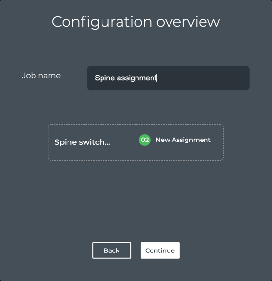 Enter a name for the job (maximum of 22 characters including spaces). Verify the configuration name and number of switches you have selected to assign this configuration to. then click Continue.