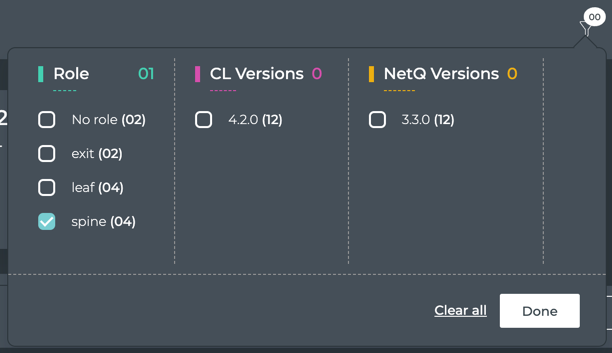 Scroll down or use the filter and Search options to help find the switches of interest. You can filter by role, Cumulus Linux version, or NetQ version. The badge on the filter icon indicates the number of filters applied. Colors on filter options are only used to distinguish between options. No other indication is intended.