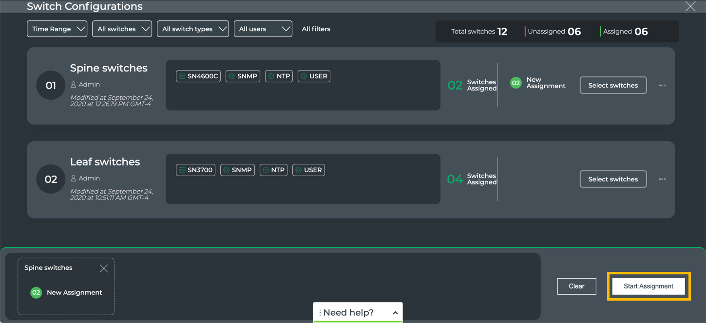 On completion, each switch shows the previous assignment and the newly applied configuration assignment.
