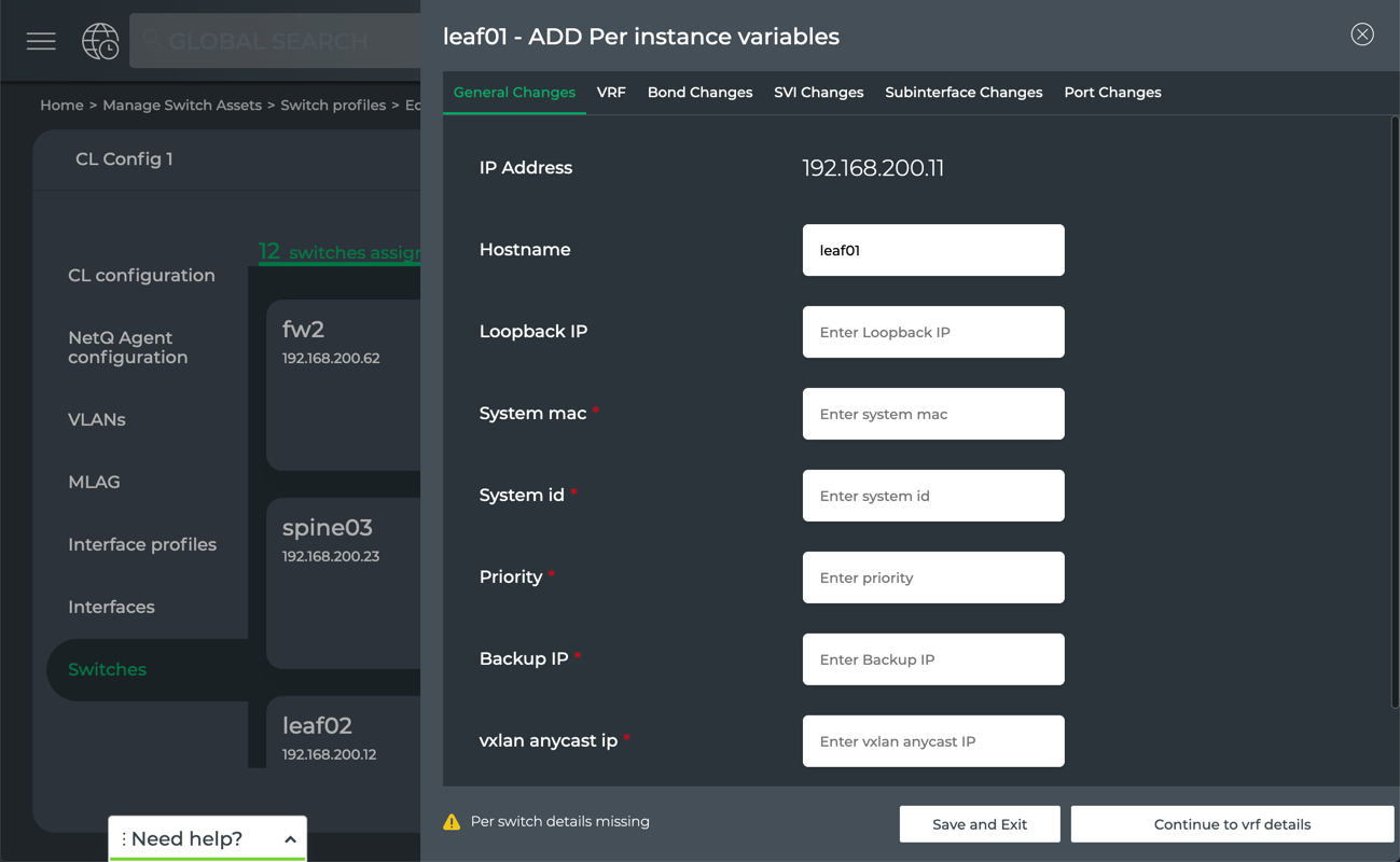 Either way, a per-instance variables form appears for the selected or one of the selected switches.