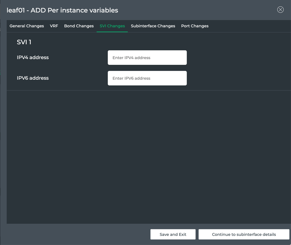 Optionally add the associated IPv4 and IPv6 addresses this switch should use for these SVIs.