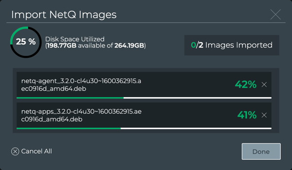 You should upload images for each network OS and NetQ version currently installed in your inventory so you can support rolling back to a known good version should an installation or upgrade fail. The NetQ UI prompts you to upload any missing images to the repository.