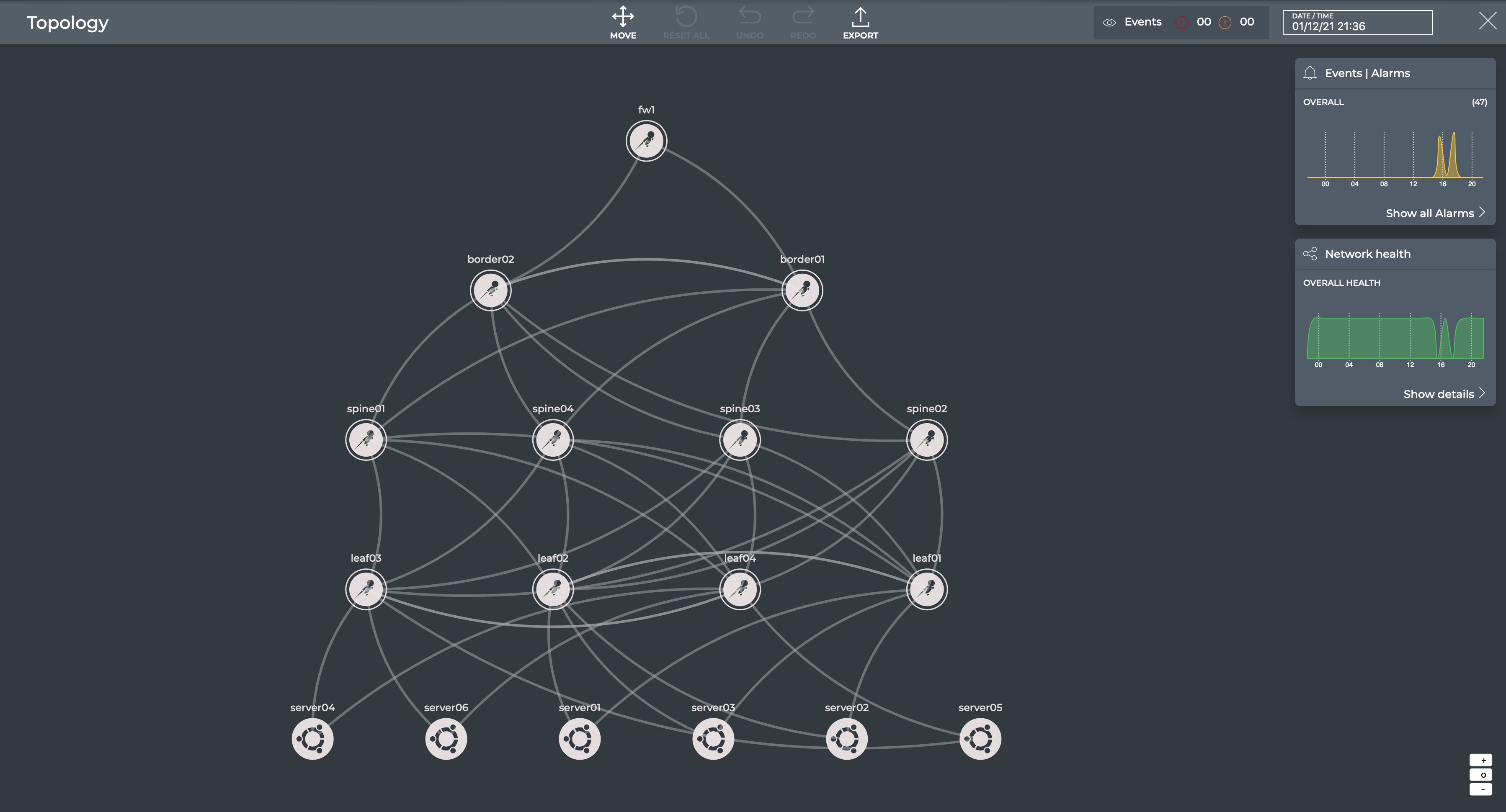 The topology view provides the option to export your topology information as a JSON file. Click Export in the header.