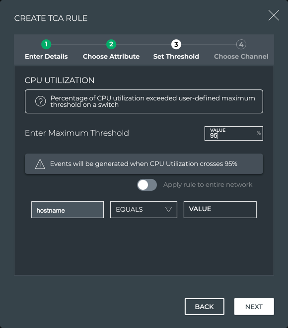 This example changes the scope for the rule TCA_CPU_UTILIZATION_UPPER to apply only to switches beginning with a hostname of leaf. You must also provide a threshold value. This example case uses a value of 95 percent. Note that this overwrites the existing scope and threshold values.
