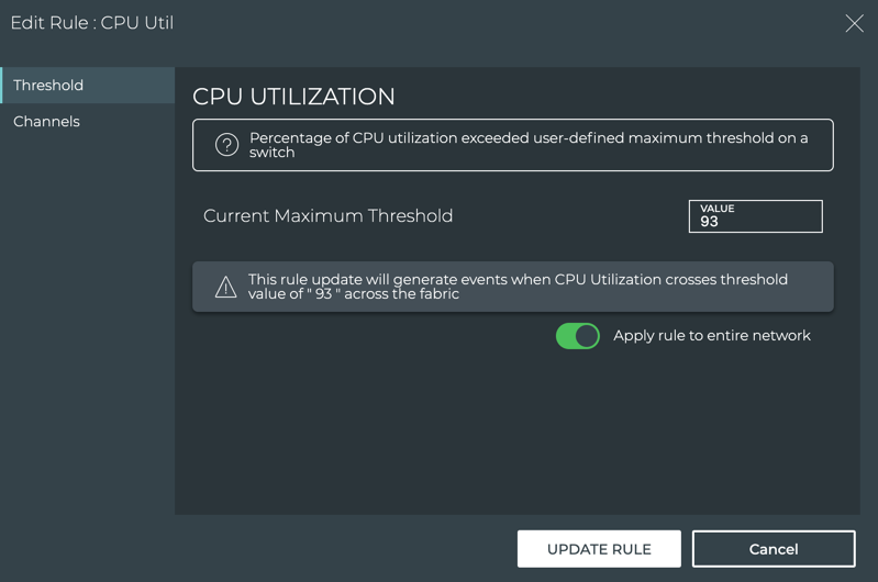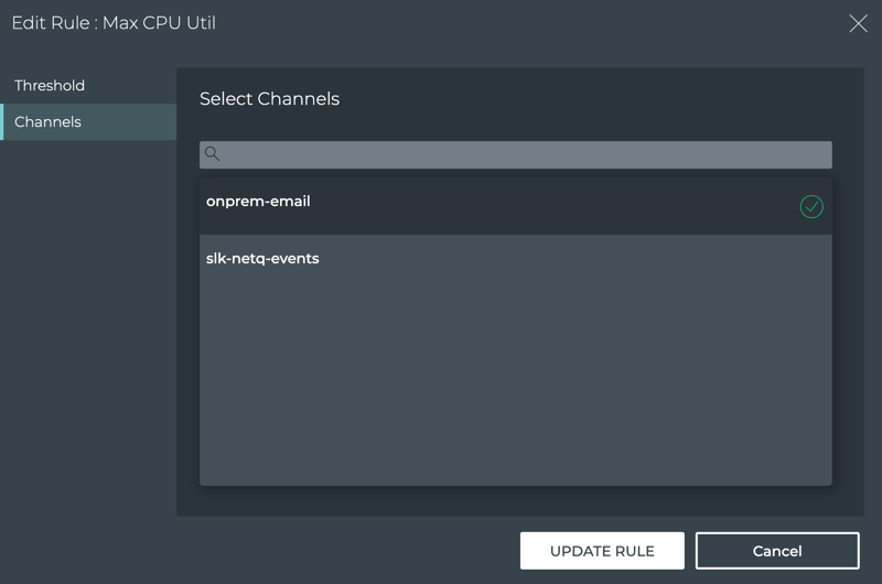 A notification configuration must contain one rule. Each rule must contain a scope and a threshold. Optionally, you can specify an associated channel. If you want to deliver events to one or more notification channels (email, syslog, Slack, or PagerDuty), create them by following the instructions in Create a Channel, and then return here to define your rule.