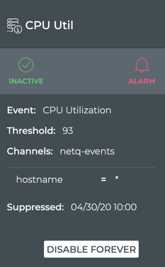 cumulus@switch:~$ netq add tca tca_id TCA_CPU_UTILIZATION_UPPER_2 suppress_until 86400