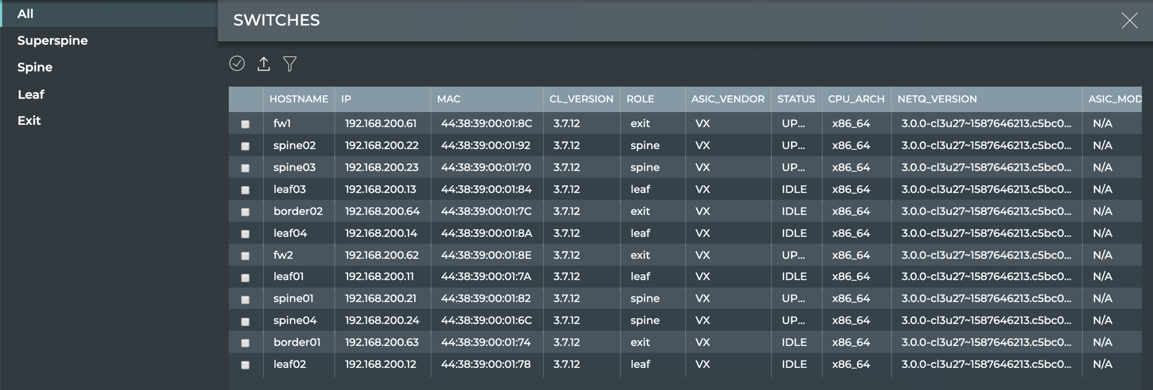 Hostname IP Address MAC Address CPU CL Version NetQ Version Config Profile Discovery Status Upgrade Status