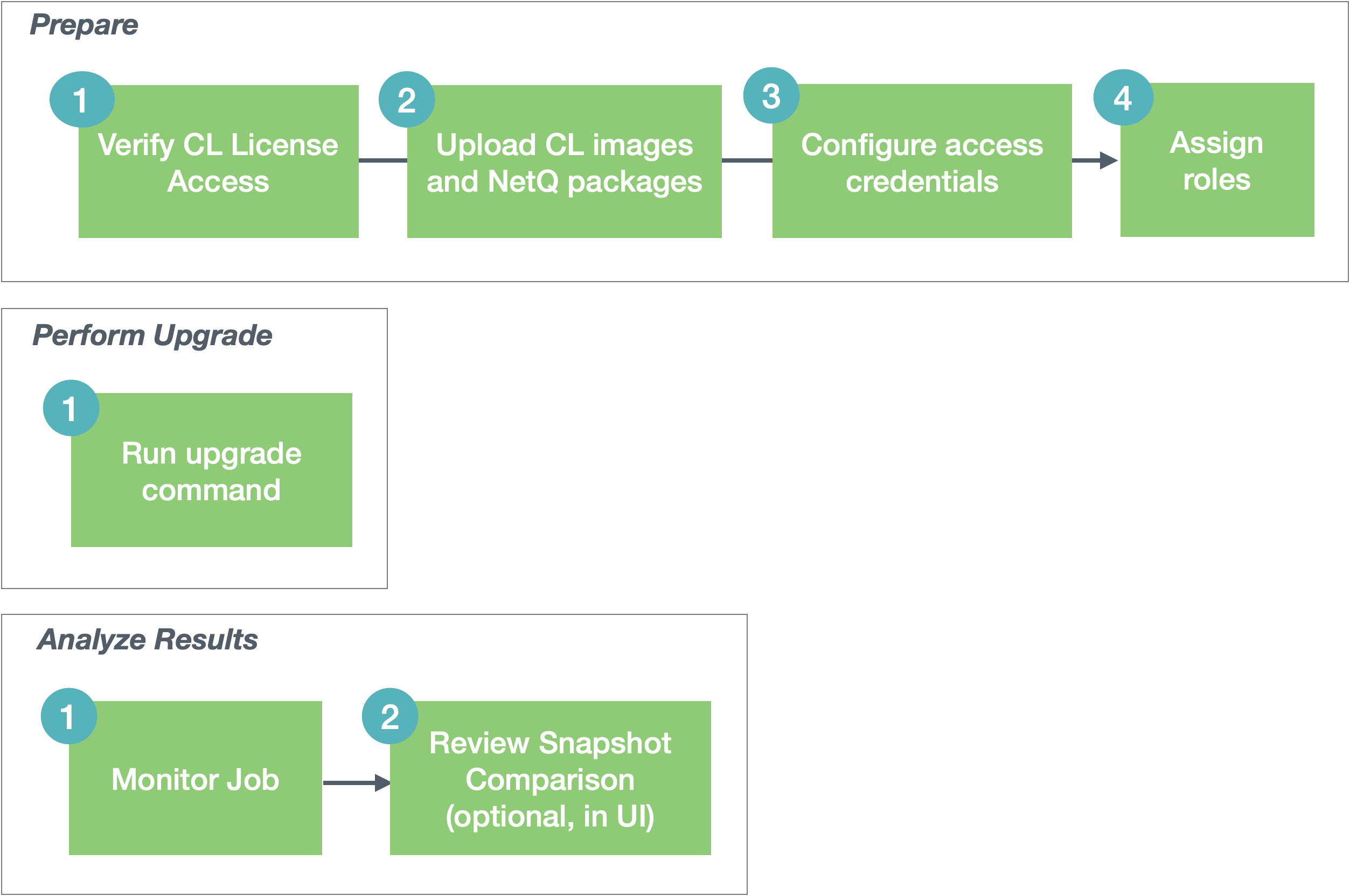 - Compare the network snapshots taken before and after the upgrade.