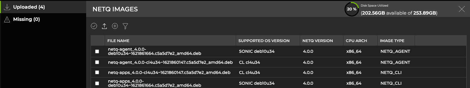 You should upload images for each network OS and NetQ version currently installed in your inventory so you can support rolling back to a known good version should an installation or upgrade fail. The NetQ UI prompts you to upload any missing images to the repository.