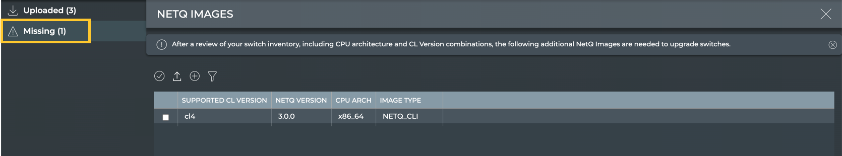 On the NetQ Images card, select View # missing NetQ images to see which images you need. This opens a list of missing images.