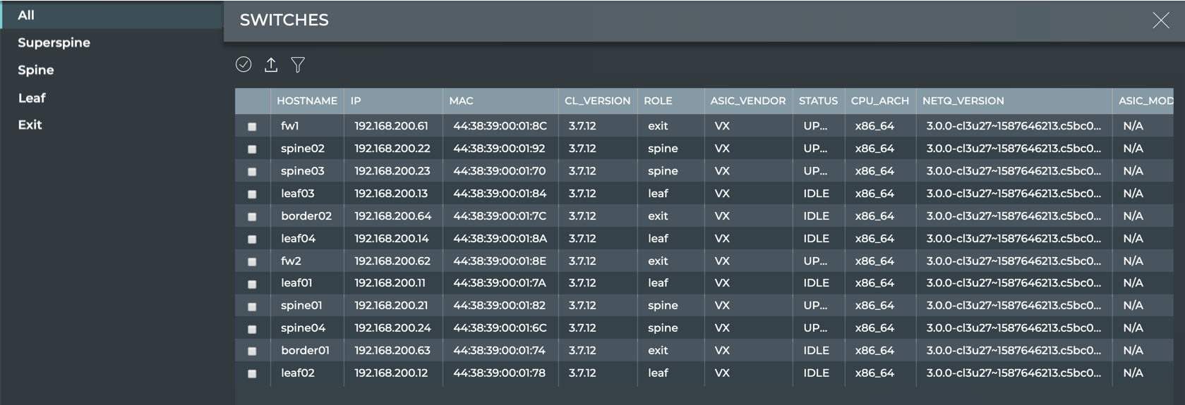 Hostname Role IP Address MAC Address CPU CL Version NetQ Version Last Changed