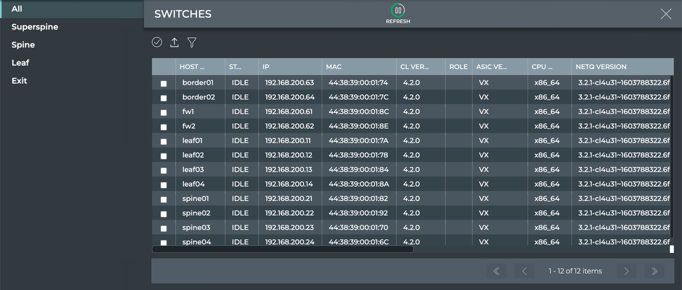 On initial installation, the lifecycle management feature provides an inventory of switches that have been automatically discovered by NetQ and are available for software installation or upgrade through NetQ. This includes all switches running Cumulus Linux 3.7.12 or later, SONiC 202012 or later, and NetQ Agent 4.1.0 or later in your network. You assign network roles to switches and select switches for software installation and upgrade from this inventory listing.