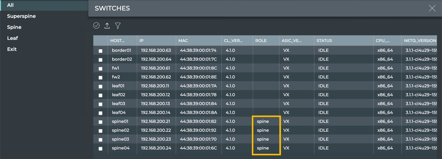 Four pre-defined switch roles are available based on the Clos architecture: Superspine, Spine, Leaf, and Exit. With this release, you cannot create your own roles.