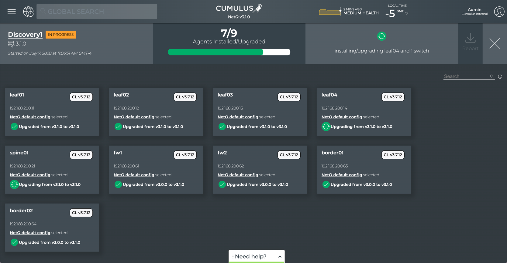 Hostname IP Address MAC Address CPU CL Version NetQ Version Config Profile Discovery Status Upgrade Status