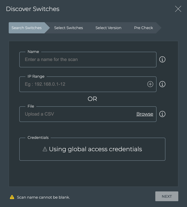 - Choose whether you want to look for switches by entering IP address ranges OR import switches using a comma-separated values (CSV) file.