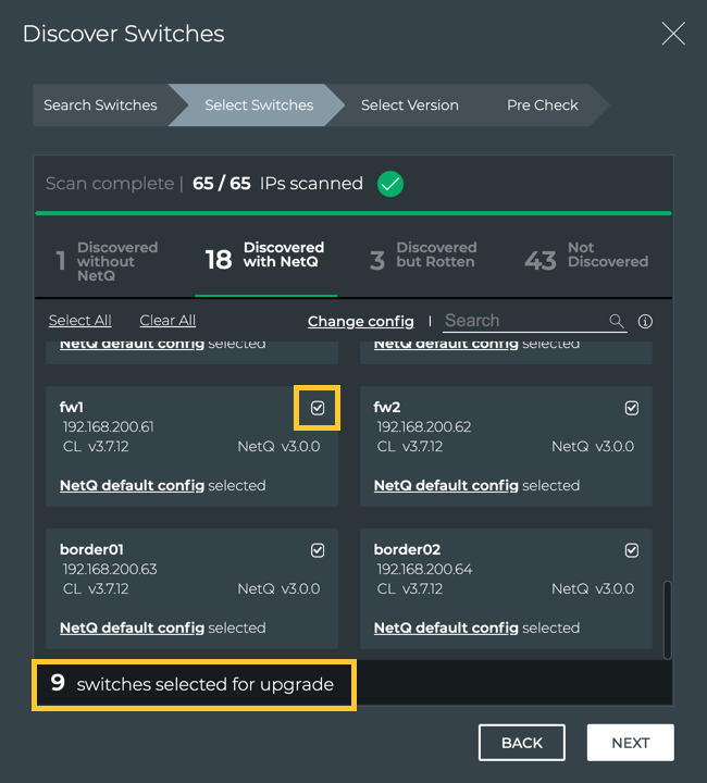 - Selected switches are not currently scheduled for, or in the middle of, a Cumulus Linux or NetQ Agent upgrade