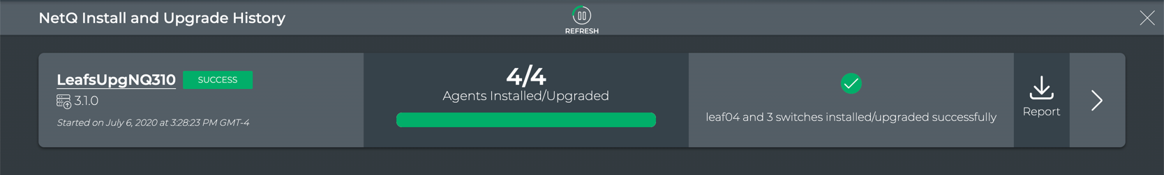 - Monitor the job through the NetQ Install and Upgrade History card on the LCM dashboard. Click