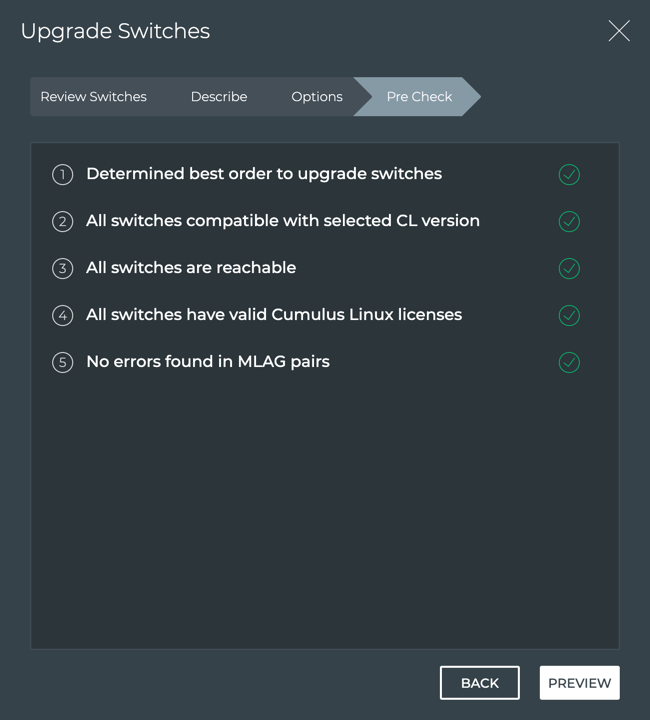 If one or more of the pre-checks fail, resolve the related issue and start the upgrade again. In the NetQ UI these failures appear on the Upgrade Preview page. In the NetQ CLI, it appears in the form of error messages in the netq lcm show upgrade-jobs cl-image command output.