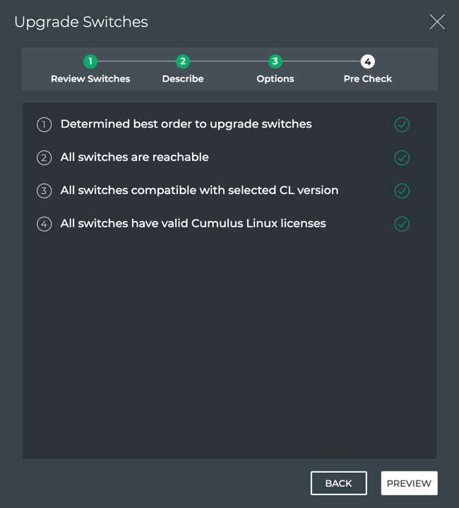 After the pre-checks have completed successfully, click Preview. If there are failures, refer to Pre-check Failures.