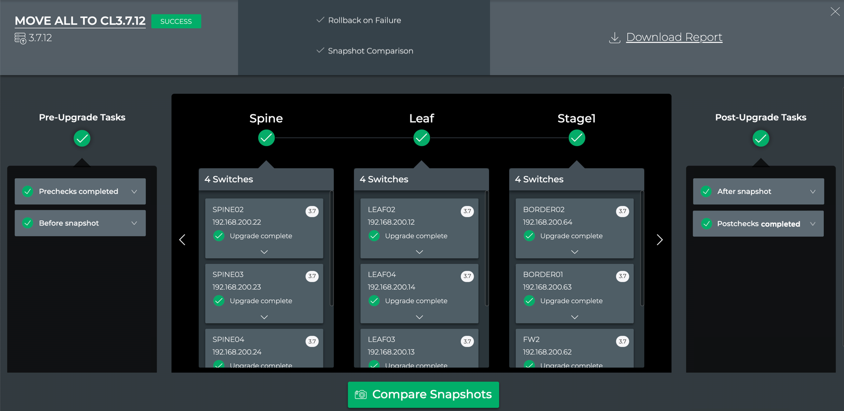 When all of your switches have roles assigned, this view displays the chosen job options (top center), the pre-checks status (top right and left in Pre-Upgrade Tasks), the order in which the switches are planned for upgrade (center; upgrade starts from the left), and the post-upgrade tasks status (right).