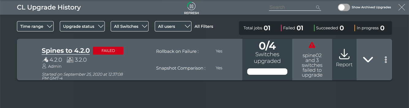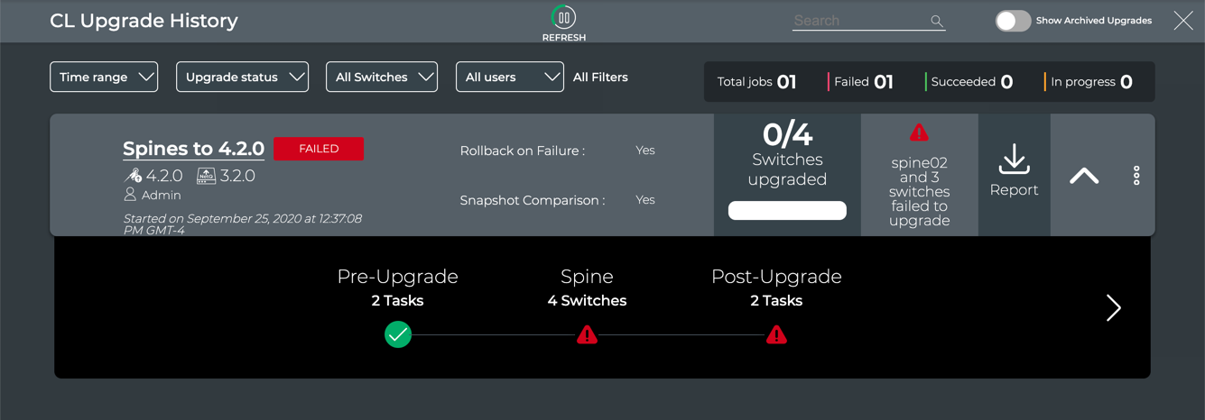 - Monitor the job through the CL Upgrade History card in the Job History tab. Click