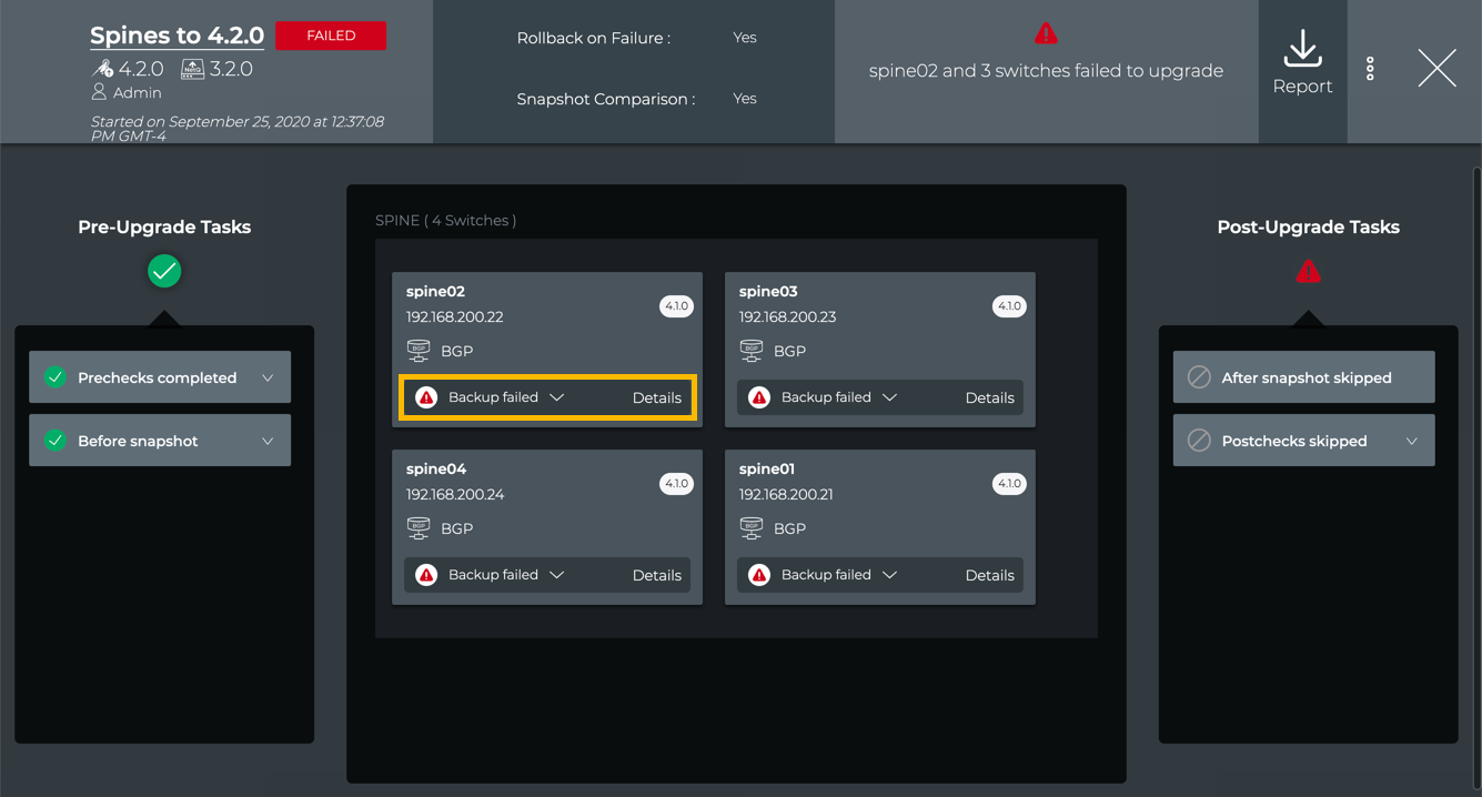 spine02 4.1.0 FAILED Fri Sep 25 16:37:40 2020 SKIPPED_ON_FAILURE N/A SKIPPED_ON_FAILURE N/A