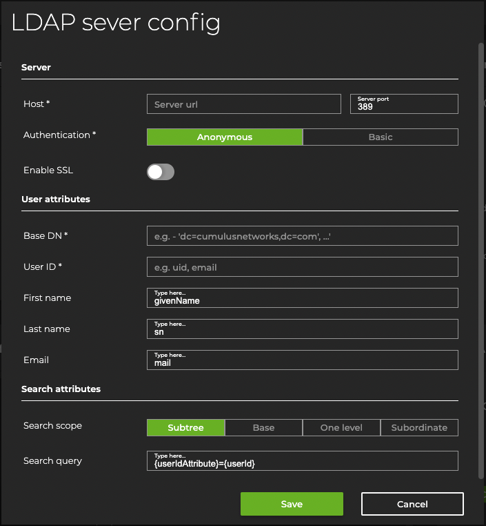 dc=mycompany,dc=com. - User ID: Type of identifier used to specify an LDAP user. This can vary depending on the authentication service you are using. For example, you can use the user ID (UID) or email address with OpenLDAP, whereas you might use the sAMAccountName with Active Directory.