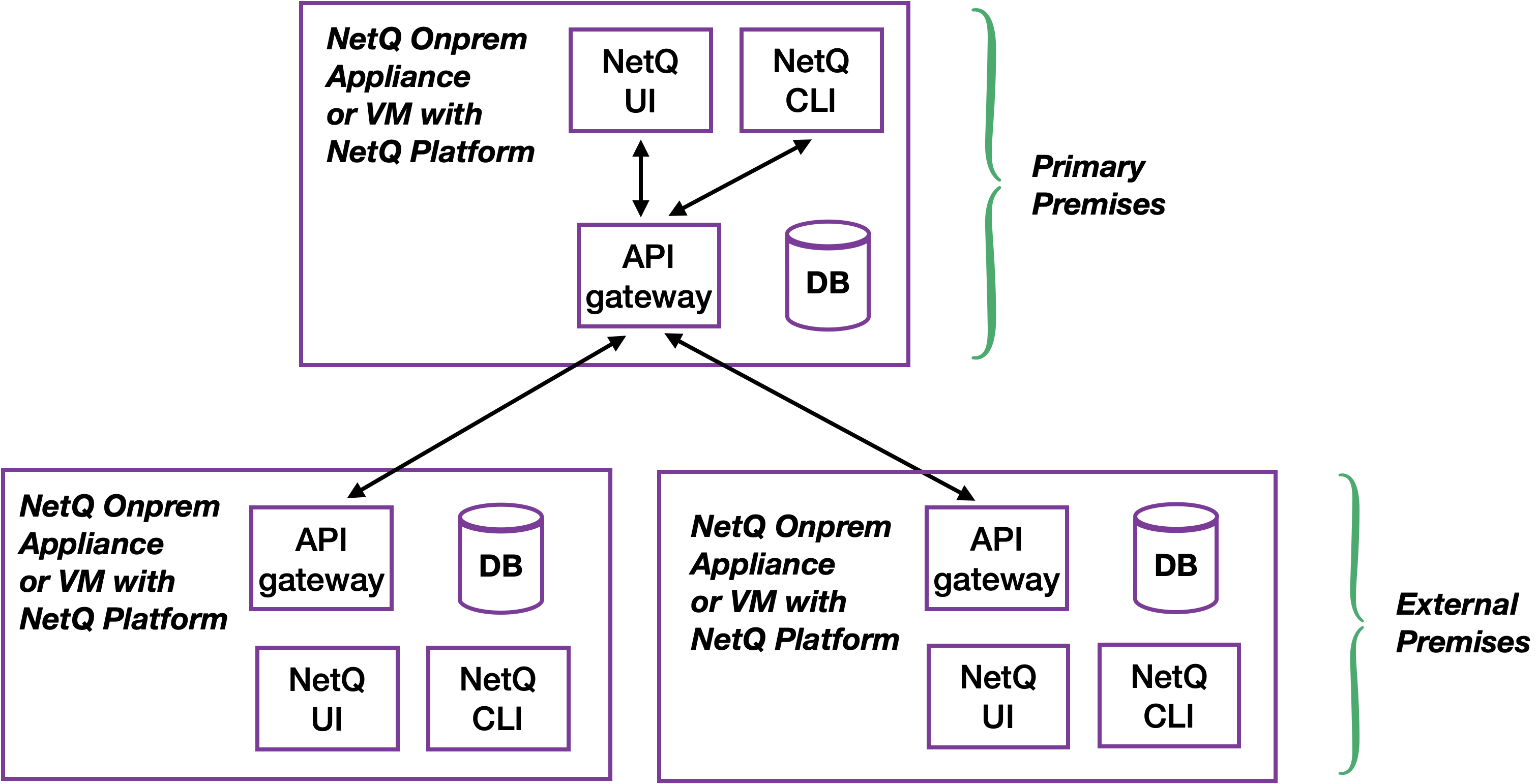 In this implementation, there is a NetQ appliance or VM running the NetQ software with a database. Each premises operates independently as an external premises, with its own NetQ UI and CLI. The NetQ appliance or VM at one of the deployments acts as the primary premises. A list of external premises is stored with the primary deployment.