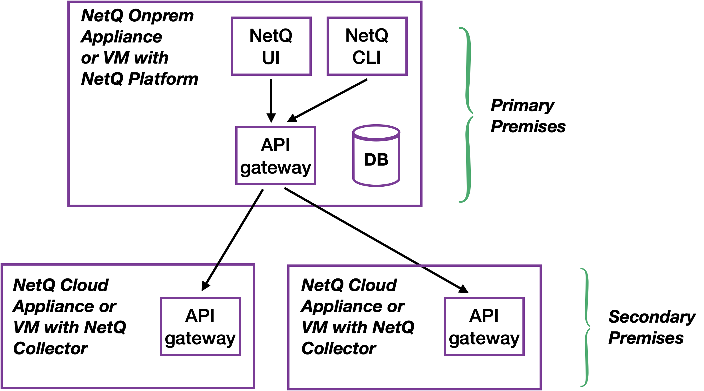 In this implementation, there is a NetQ appliance or VM at one of the deployments acting as the primary premises for the other deployments. The primary premises runs the NetQ software (including the NetQ UI and CLI) and houses the database. All other deployments are secondary premises; they run the NetQ cloud software and send their data to the primary premises for storage and processing. A list of these secondary premises is stored with the primary deployment.