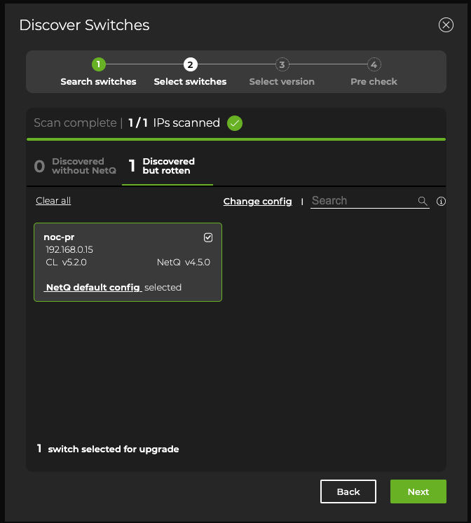 Select which switches you want to upgrade from each discovered category by clicking the checkbox on each switch card. Then click Next.