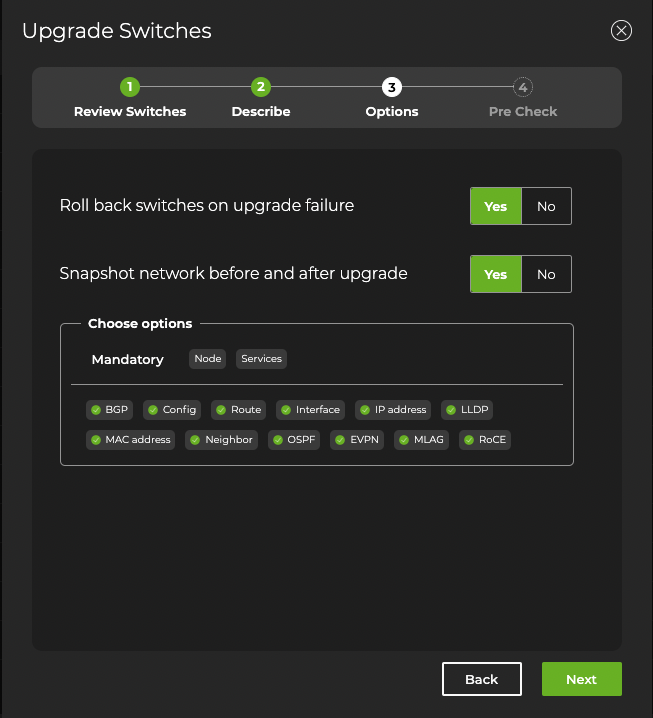 Upgrade OS above the table.Follow the steps in the UI. Create a name for the upgrade and review the switches that you selected to upgrade: