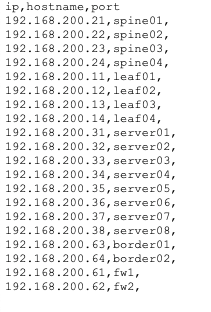 The CSV file must include a header containing hostname, ip, and port. They can be in any order you like, but the data must match that order. For example, a CSV file that represents the Cumulus reference topology could look like this: