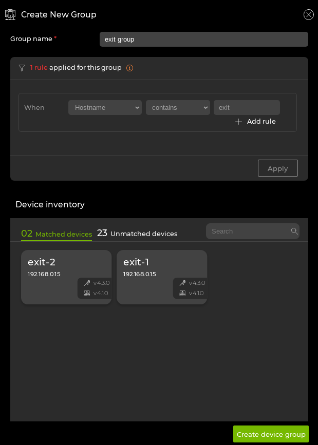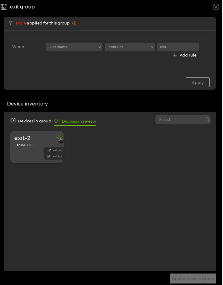 The following example shows a group name of “exit group” matching any device in the inventory with “exit” in the hostname: