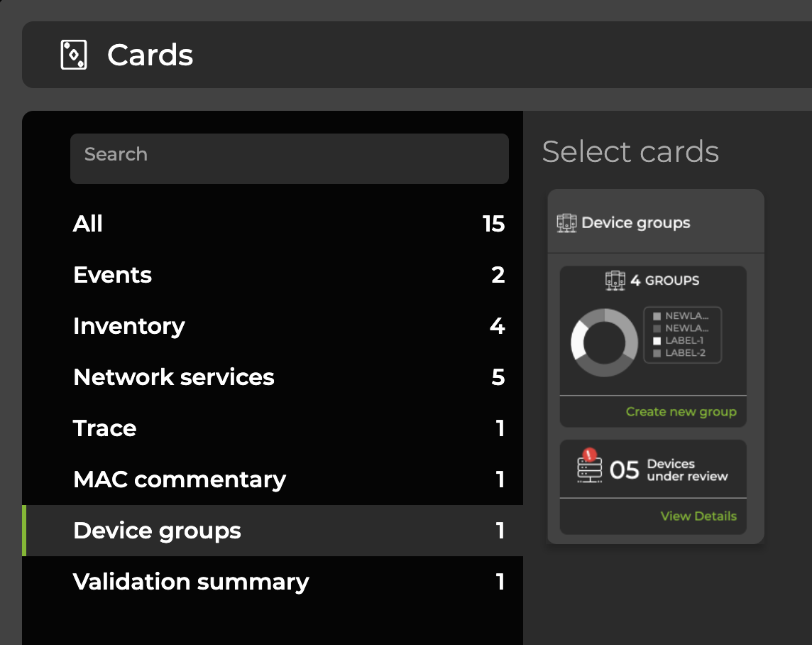 To create a device group, add the Device Groups card to your workbench. In the header, click Open card. Select the Device groups card: