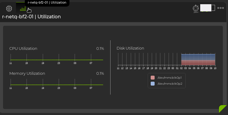 Click Add. This example shows that the r-netq-bf2-01 DPU has low utilization across CPU, memory, and disks: