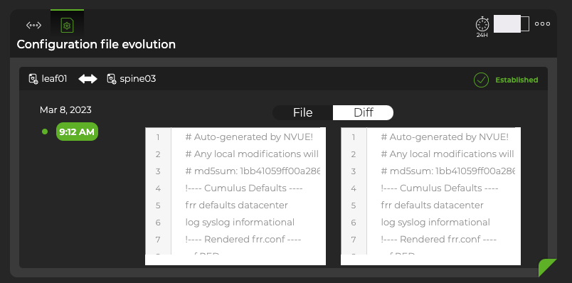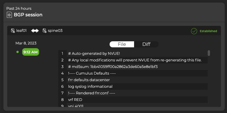 Each time a change is made to the configuration file for the BGP service, NetQ logs the change and lets you compare it with the previous version. This can be useful when you are troubleshooting potential causes for events or sessions losing their connections.