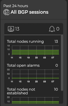 To add the BGP card to your workbench, navigate to the header and select Add card > Network services > All BGP Sessions card > Open cards. In this example, there are 13 nodes running the BGP protocol, 0 open events (from the last 24 hours), and 10 nodes with unestablished sessions.