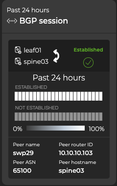 The BGP single-session card displays the node, its peer, its status (established or unestablished), and its router ID. This information can help you determine the stability of the BGP session between two devices. The heat map indicates the status of the session over the designated time period. In this example, the session has been established throughout the entire time period: