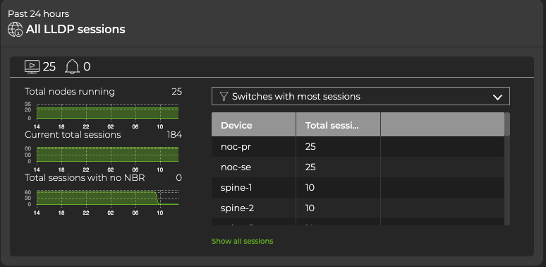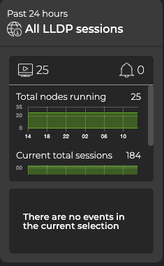 To add the LLDP card to your workbench, navigate to the header and select Add card >Network services >All LLDP Sessions card > Open cards. In this example, there are 25 nodes running the LLDP protocol, 184 established sessions, and no LLDP-related events from the past 24 hours:
