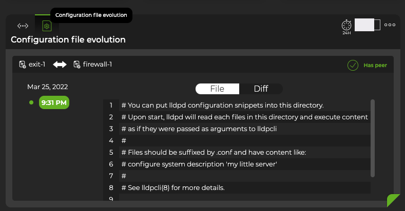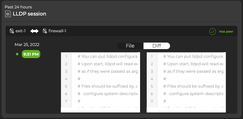 Each time a change is made to the configuration file for the LLDP service, NetQ logs the change and lets you compare it with the last version using the NetQ UI. This can be useful when you are troubleshooting potential causes for alarms or sessions losing their connections.