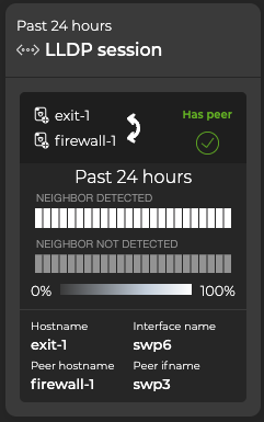 On the medium and large single-session cards, vertically stacked heat maps represent the status of the neighboring peers: one for peers that are reachable (neighbor detected) and one for peers that are unreachable (neighbor not detected). Depending on the time period of data on the card, the number of smaller time blocks used to indicate the status varies. A vertical stack of time blocks, one from each map, includes the results from all checks during that time. The results appear by how saturated the color is for each block. If LLDP detected all peers during that time period for the entire time block, then the top block is 100% saturated (white) and the neighbor not detected block is 0% saturated (gray). As peers become reachable, the neighbor-detected block increases in saturation and the peers that are unreachable (neighbor not detected) block is proportionally reduced in saturation. The following table lists the most common time periods, their corresponding number of blocks, and the amount of time represented by one block:
