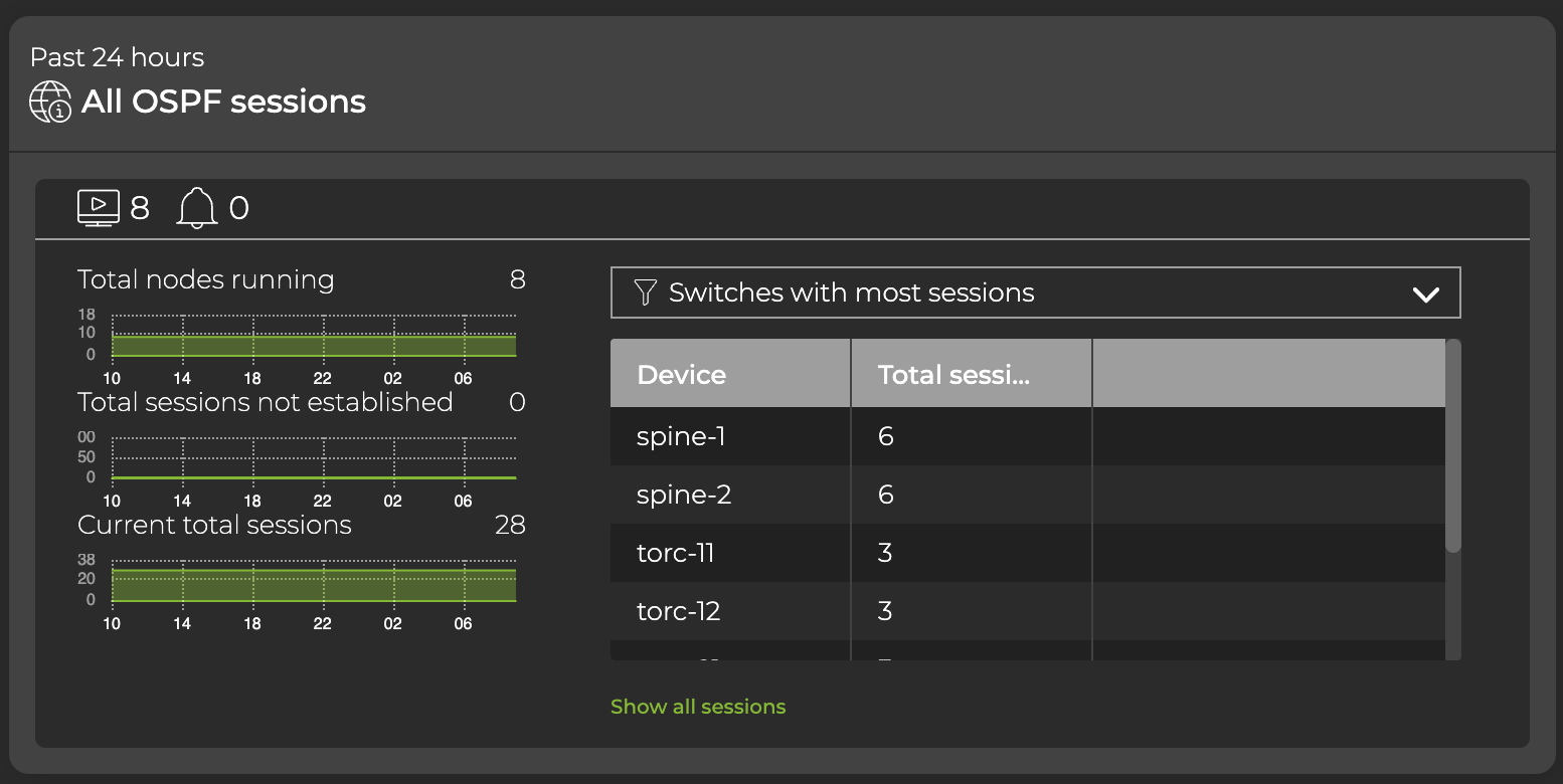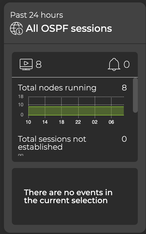 To add the OSPF card to your workbench, navigate to the header and select Add card > Network services > All OSPF Sessions card > Open cards. In this example, there are 8 nodes running OSPF and no reported events.