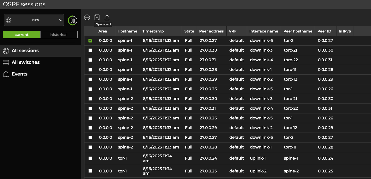Expand the OSPF card to full-screen to view, filter, or export all stored attributes of all switches and hosts running OSPF in your network.