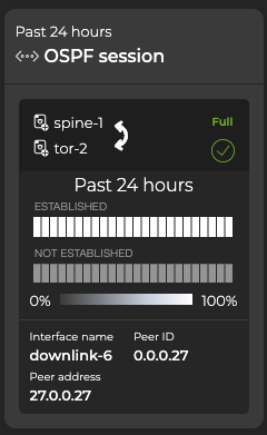 The OSPF single-session card displays the interface name, peer address, and peer ID that identifies the session. The heat map indicates the stability of the OSPF session between two devices over a period of time. In this example, the session has been established throughout the past 24 hours: